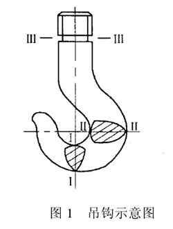 吊鉤是江陰凱澄電動(dòng)葫蘆重要的取物裝置,國(guó)內(nèi)起重機(jī)吊鉤(75t以下)使用多的是鍛鉤。根據(jù)吊鉤結(jié)構(gòu)和受力狀況,一般認(rèn)為存在如圖1所示的三個(gè)Ⅰ-ⅠⅡ-Ⅱ和Ⅲ-Ⅲ危險(xiǎn)截面。文獻(xiàn)認(rèn)為Ⅱ-Ⅱ截面是吊鉤易發(fā)生疲勞變形或斷裂的危險(xiǎn)截面。但從檢驗(yàn)角度上看,Ⅲ-Ⅲ斷面處于橫截面突然變小的鉤頸退刀槽處,它是鉤尾軸部分承受拉應(yīng)力大、強(qiáng)度弱的截面。