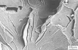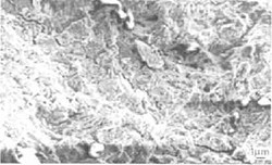 圖5為疲勞條紋形態(tài),其條紋主要為韌性條帶,此時(shí)條帶相對(duì)較窄而當(dāng)裂紋進(jìn)一步擴(kuò)展時(shí)裂紋條帶逐漸變寬,從圖中還可以看到疲勞裂紋條帶較為粗大,二次裂紋非常多,即破壞已相當(dāng)嚴(yán)重。此時(shí)已預(yù)示著吊鉤的壽命快到盡頭了。