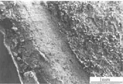采用日本產(chǎn)的JSM-6300型掃描電子顯微鏡對(duì)斷口微觀特征進(jìn)行分析(以下電鏡照片左下角為外壁方向,右上角為徑向,即裂紋擴(kuò)展方向)。如圖3所示,整個(gè)斷面較為平整,但在斷裂邊緣處有一近似45b的斜斷面,寬約1mm,從圖中可看到新舊斷口全貌,中部舊裂紋是在使用過(guò)程中由于低周疲勞所形成的,右邊新斷口是瞬斷而形成的。